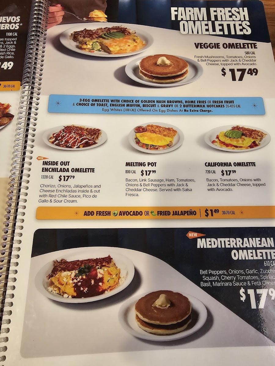 Our 3 Farm Fresh Egg Veggie Omelette is filled with Fresh Mushrooms, Tomatoes, Onions & Bell Peppers with Jack & Cheddar Cheese. Topped with fresh, sliced Avocado. Includes Golden Hash Browns or Fresh Fruit, and your choice of Toast, English Muffin, Biscuit and Gravy or 2 Buttermilk Hotcakes.
